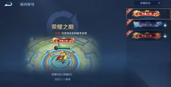 荣耀挑战-挑战值达60获取,仅程咬金皮肤——演武夺筹可用 5、生涯称号——荣耀之巅S23