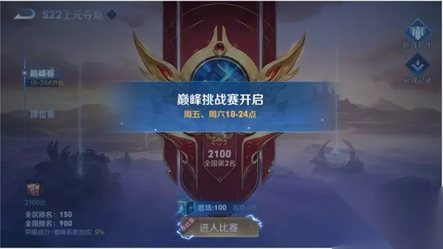 参与条件:每周五~周六晚上18点-24点开启巅峰挑战赛,本赛季最高段位达到王者的玩家可参与,符合参与条件的召唤师在开启时间范围内点击“进入比赛”按钮即可开启比赛(挑战赛不为独立模式,兼容巅峰赛本身的所有规则)