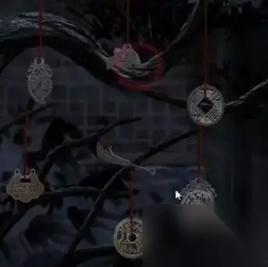 4、根据书中所说的顺序拜访树上挂的配饰: 从左到右,从上到下依次是:茄子、鱼、方孔铜钱、锁、刀、刀挂圆孔铜钱、水果。