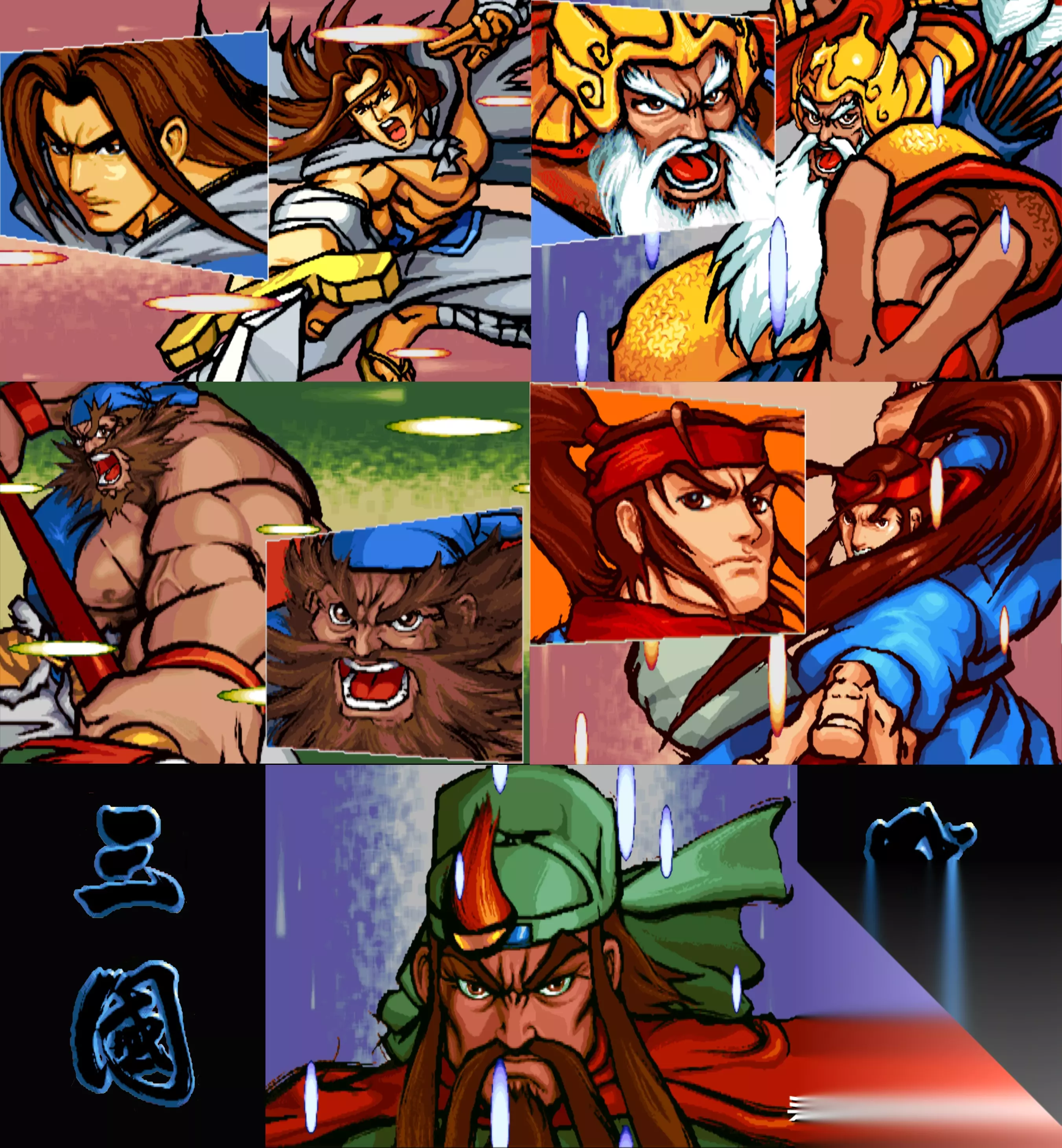 五虎上将 三、游戏版本 和《西游释厄传》一样,《三国战纪》的版本也非常的多,除去后期的民间魔改版,单单官方版本就高达几十种,为了方便大家观看,在这里我简单的把所有的官方版本都总结一下。 3.1、《三国战纪》原版 《三国战纪》原版共有8名可选角色,分别是五虎上将:关羽、张飞、赵云、马超、黄忠,和三位隐藏角色:诸葛亮、张辽、貂蝉。