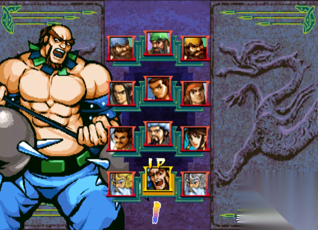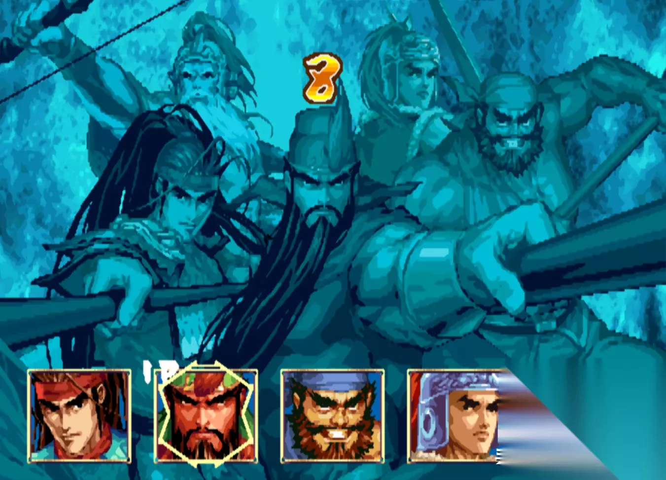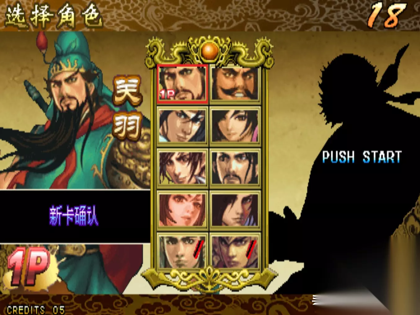 角色选择界面 《三国战纪:一统中原》是在《三国战纪:风云再起》的基础上再次加强的版本,不过这个版本IGS并未公开发售,而且将其卖给了国内的代理公司“华通电子”,华通利用这个版本,开发出来了一款非官方的民间版本:《三国战纪:乱世枭雄》。