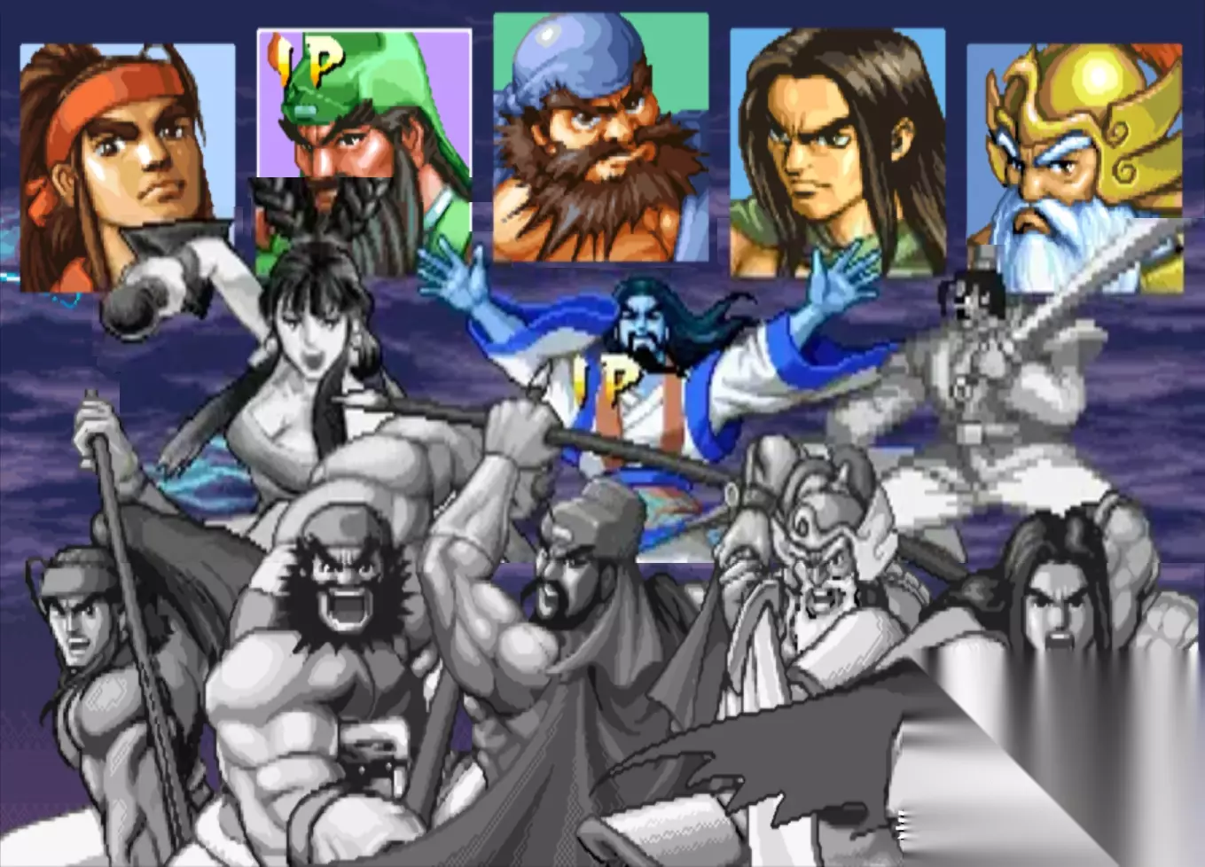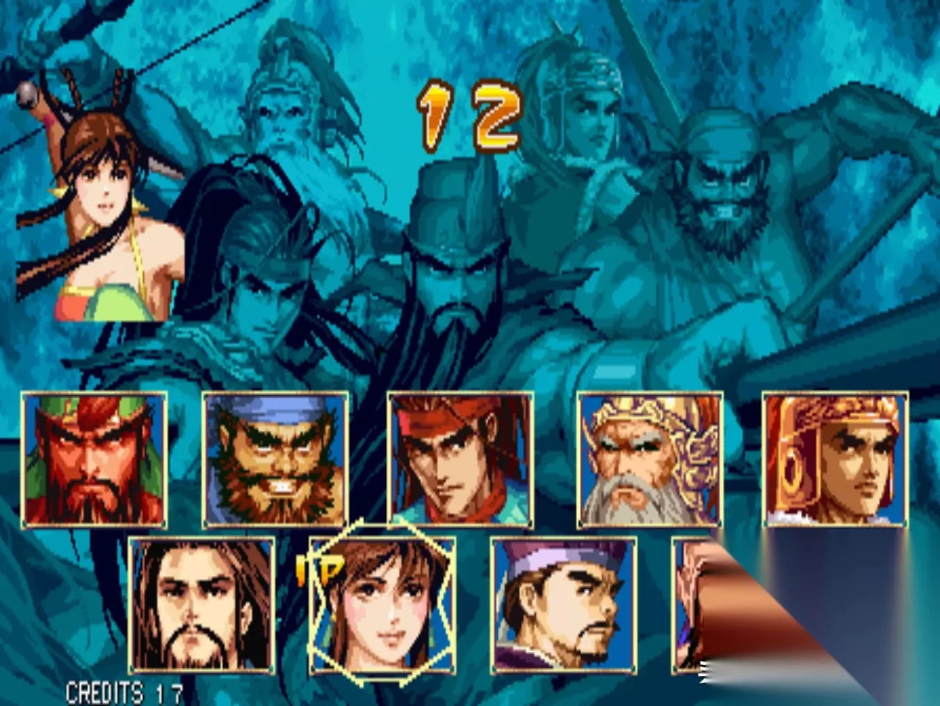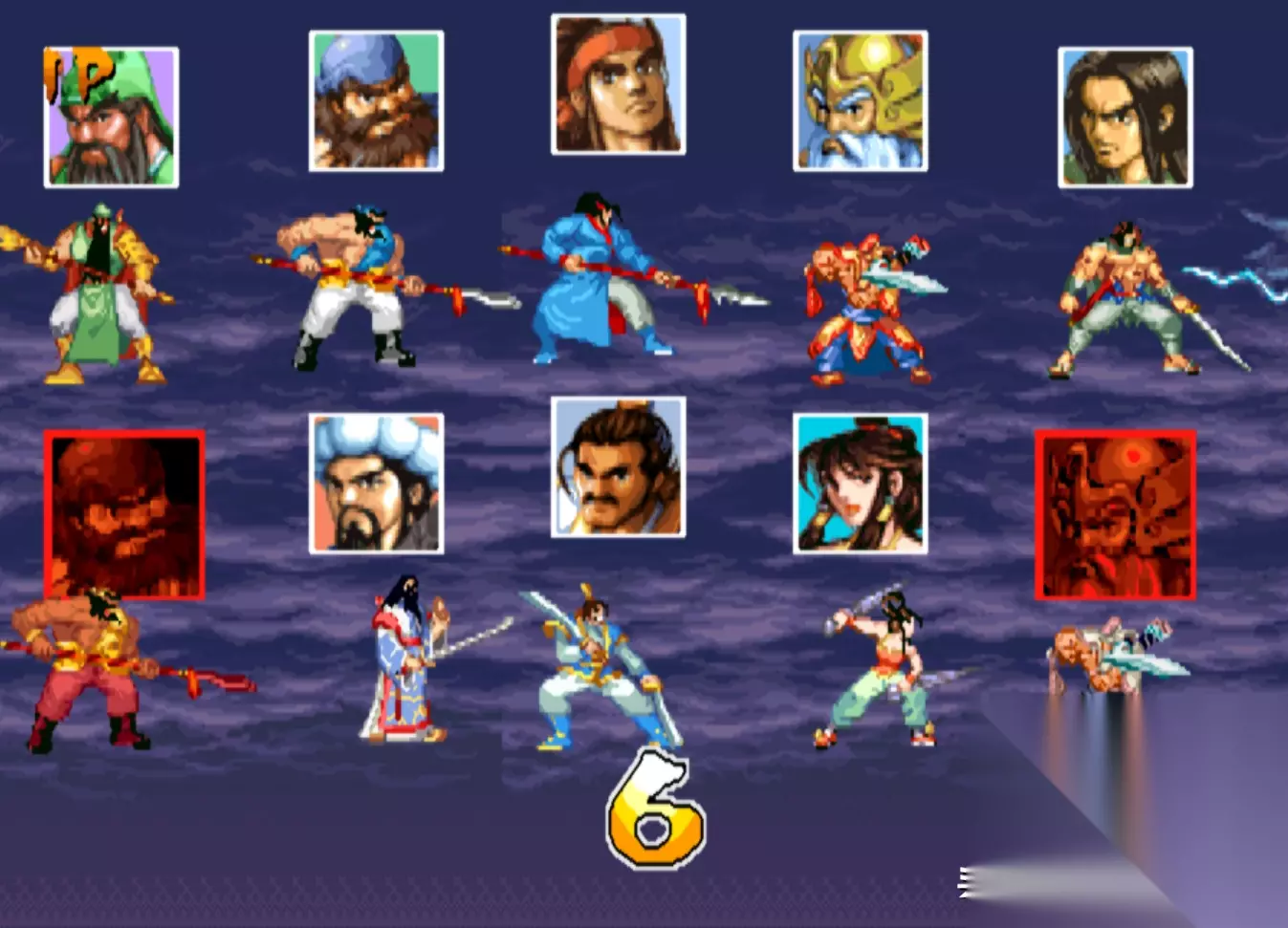 角色选择界面 《三国战纪:一统中原》是在《三国战纪:风云再起》的基础上再次加强的版本,不过这个版本IGS并未公开发售,而且将其卖给了国内的代理公司“华通电子”,华通利用这个版本,开发出来了一款非官方的民间版本:《三国战纪:乱世枭雄》。