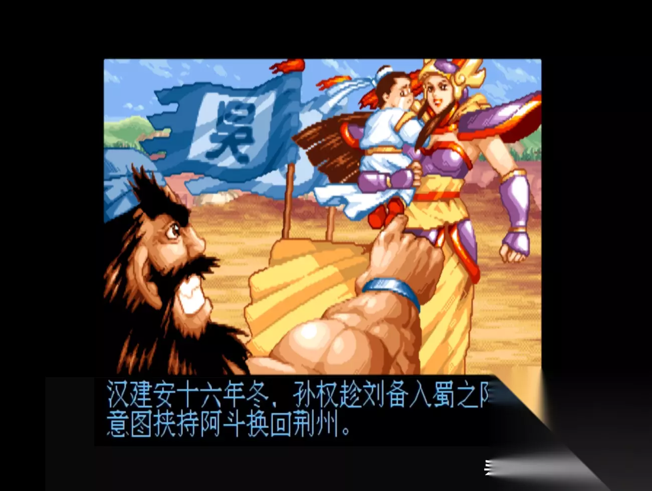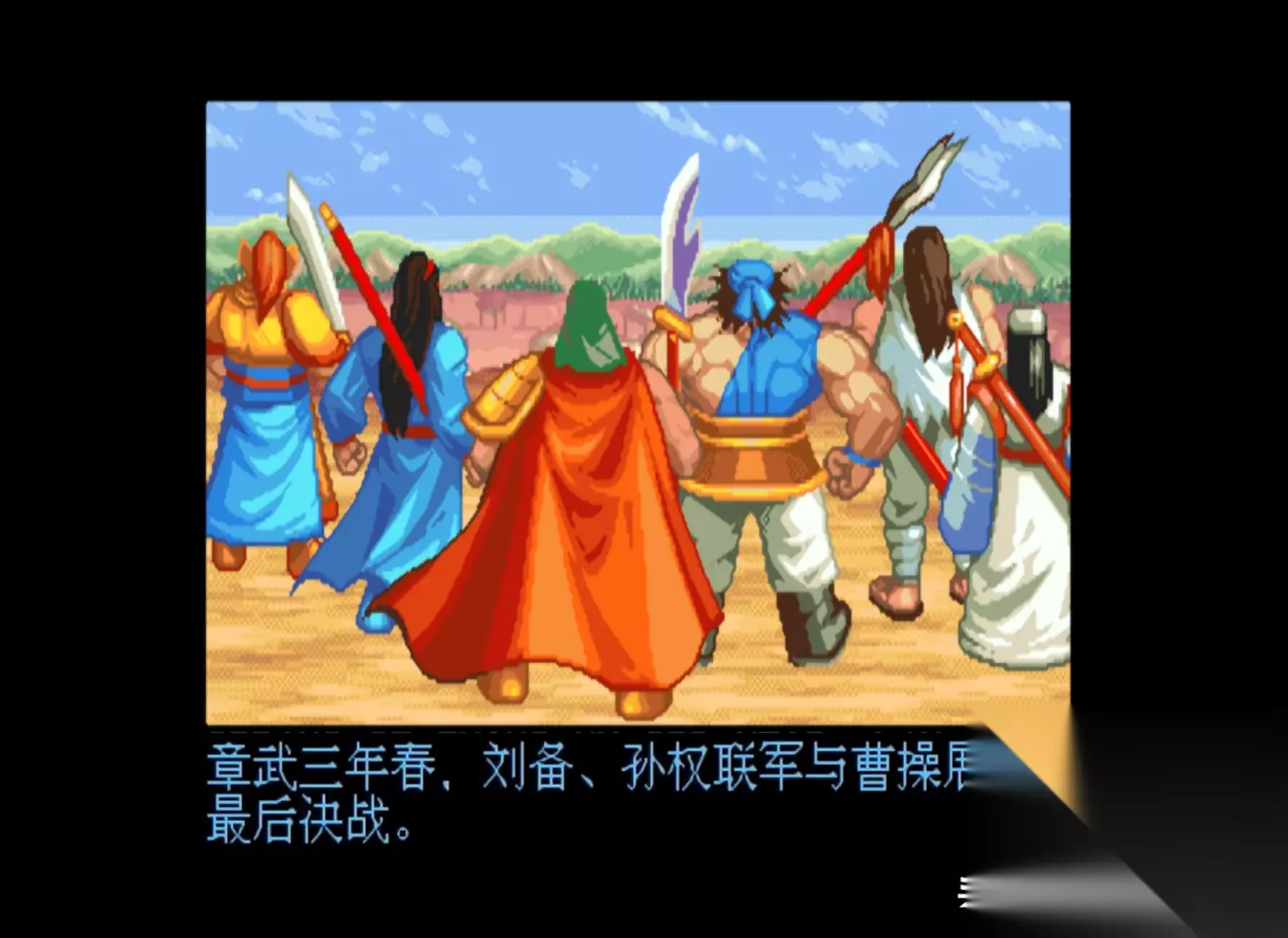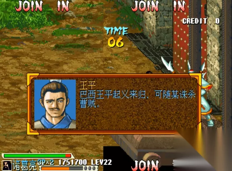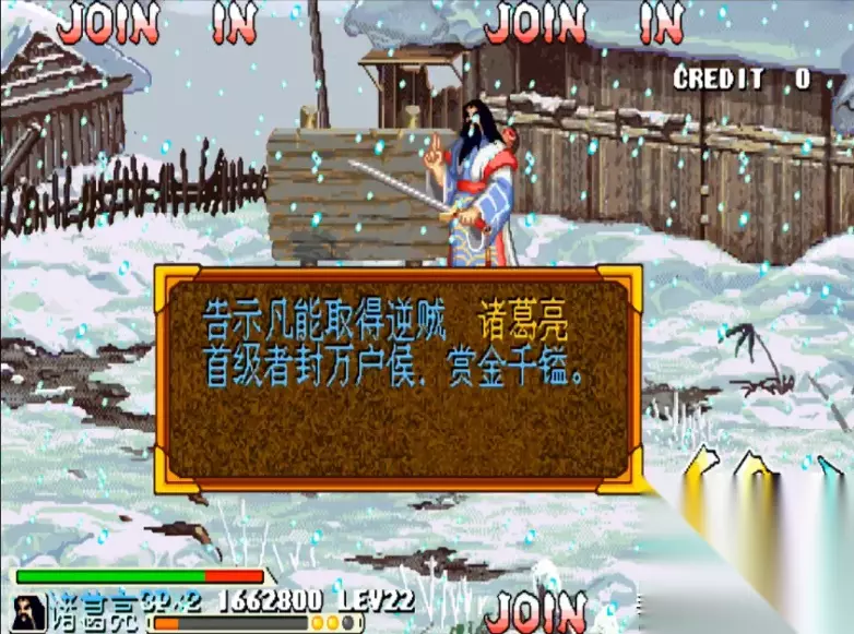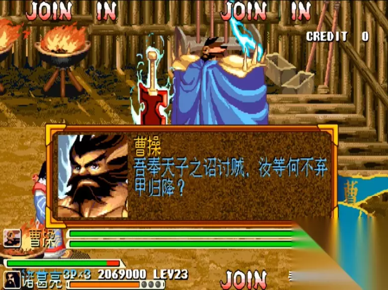 游戏画面 游戏的背景大家应该都比较熟悉,这里我就不过多介绍了,不过值得一提的是,《三国战纪》共有七关,其中前三关的剧情和《三国演义》基本一致,但从第四关“大意失荆州”开始,IGS就开启了魔改之路,例如关羽败走麦城,但他却并没有死;例如刘备经历了火烧连营的打击,竟然也没有死;而之后蜀国更是犹如开了挂一般,不仅平定了中原,而且还实现了“三国归一统”,成为了“三国鼎立”中唯一的赢家。