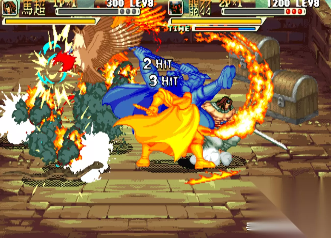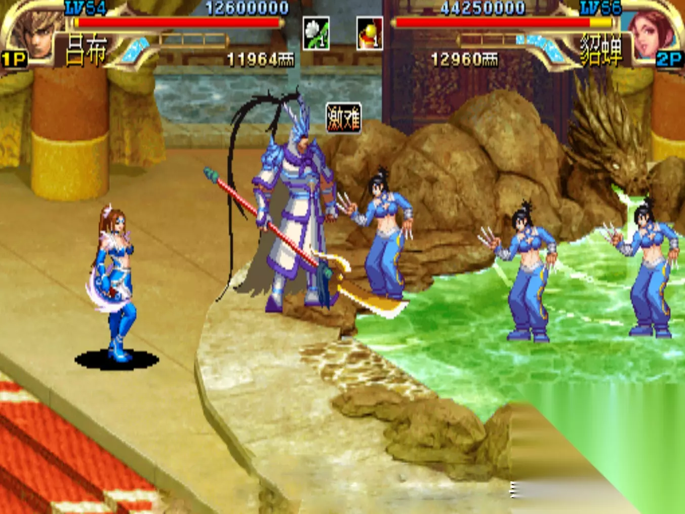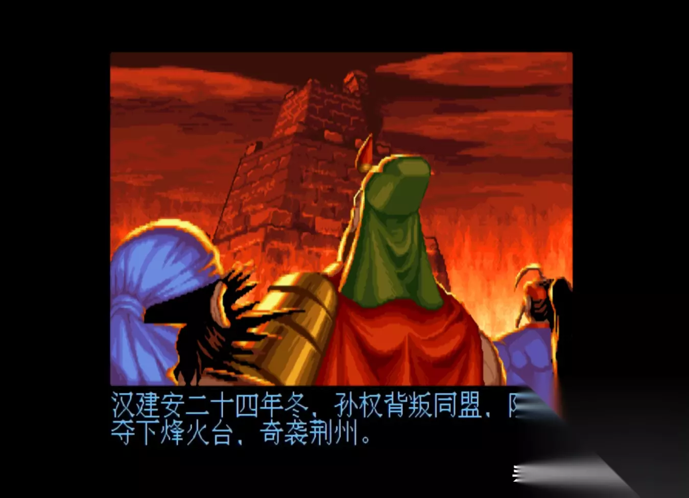 游戏画面 游戏的背景大家应该都比较熟悉,这里我就不过多介绍了,不过值得一提的是,《三国战纪》共有七关,其中前三关的剧情和《三国演义》基本一致,但从第四关“大意失荆州”开始,IGS就开启了魔改之路,例如关羽败走麦城,但他却并没有死;例如刘备经历了火烧连营的打击,竟然也没有死;而之后蜀国更是犹如开了挂一般,不仅平定了中原,而且还实现了“三国归一统”,成为了“三国鼎立”中唯一的赢家。