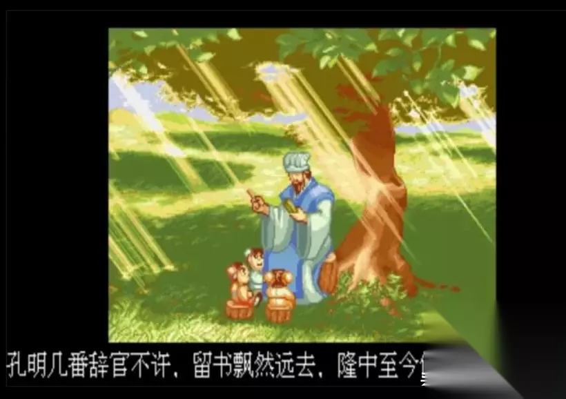 对战曹操 最终,蜀国的将士们打败了曹操,自此汉室复兴,动乱的三国时期终于宣告结束。 4.8、通关结局 在游戏通关以后,IGS专门为每名角色都安排了一个天下统一后的结局。 1、诸葛亮辞官归隐,飘然远去