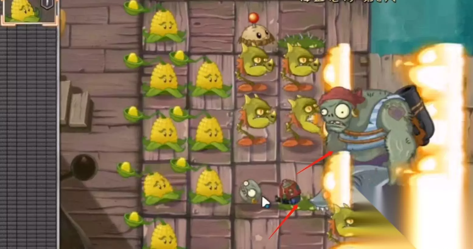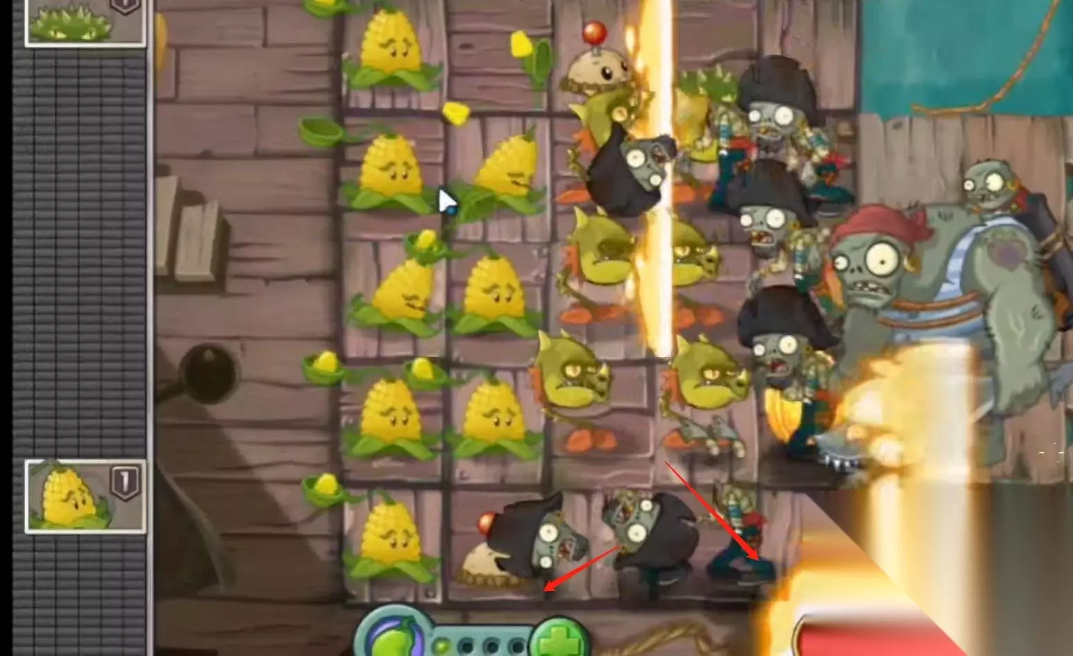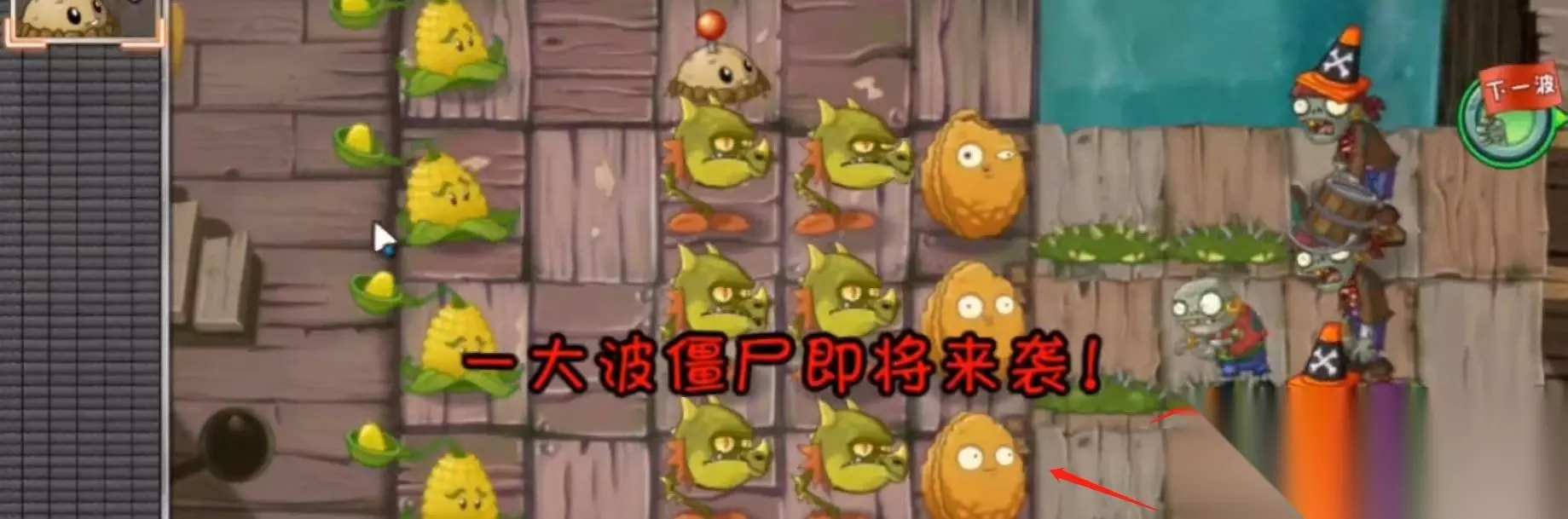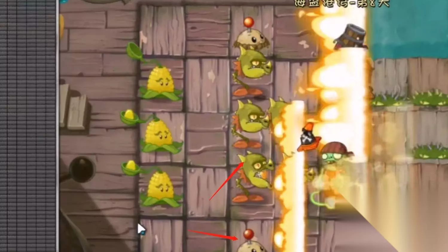 接着还可以在前面放置地雷进行攻击僵尸,结合玉米投手不断地攻击。