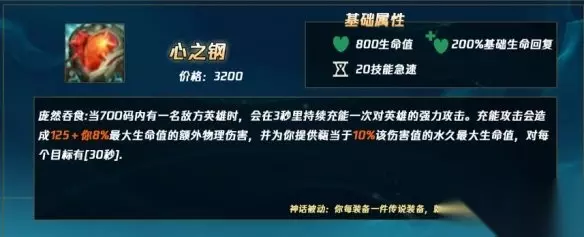 3、心之钢被动叠加对每个敌人都有单独的CD时间,CD时间是30秒; 4、在团战中玩家攻击到敌方五人时就可以叠五层,叠加层数后玩家不仅有血量加成,英雄体型也会变大; 5、每拥有一件传说装备,该英雄就会获得1%生命值提升和6%英雄体型。