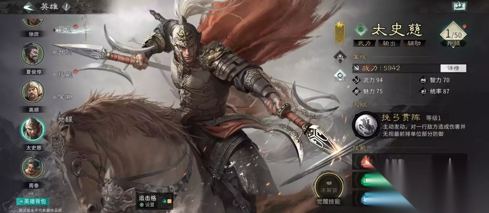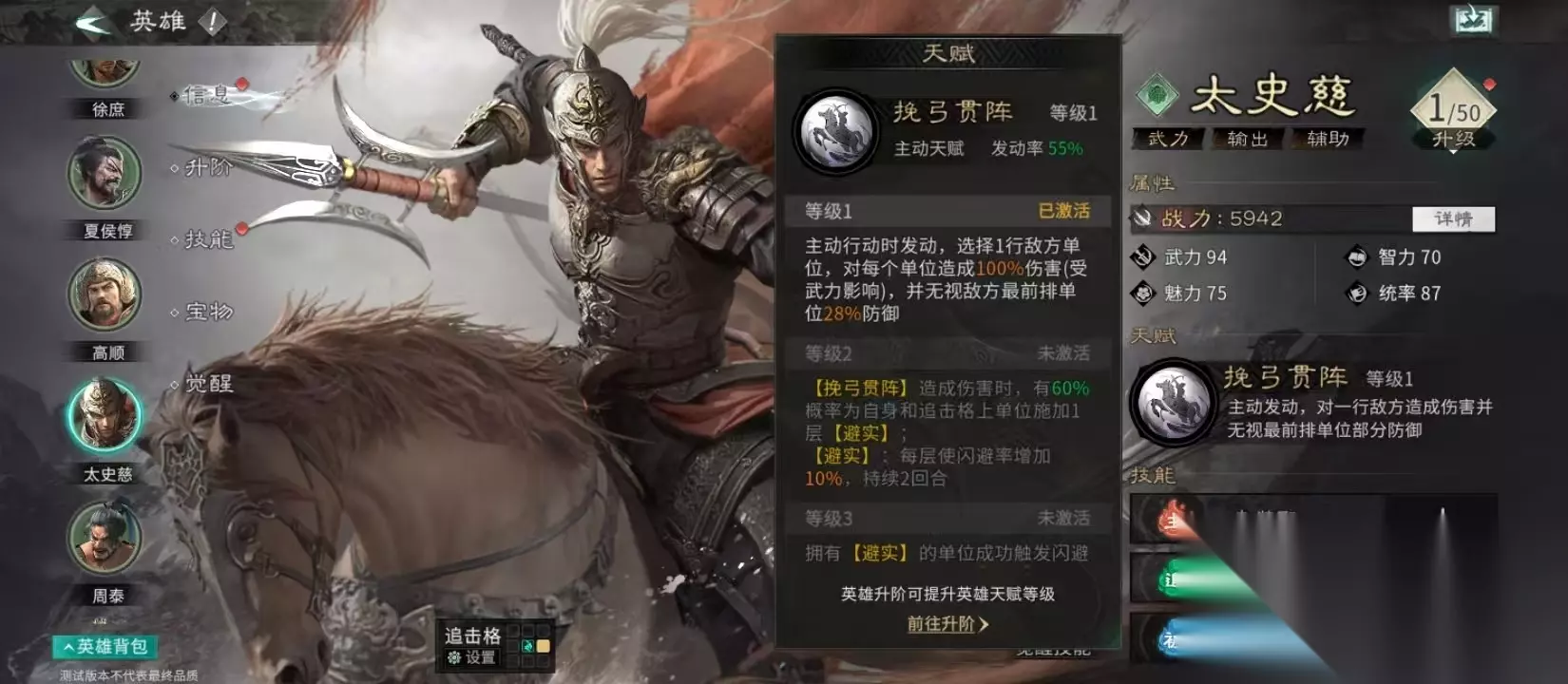 核心天赋“挽弓贯阵”是太史慈的核心竞争力所在。该技能1级即拥有55%发动概率,三回合内基本可稳定触发一次。技能效果包含双重维度:其一,对敌方一整行单位造成100%武力伤害,具备显著AOE压制力;其二,“傲世”效果无视目标最前排28%防御,直击高护甲坦克的防御软肋,大幅降低破盾门槛,为后续队友的持续输出创造有利条件。若搭配具备全队提速能力的辅助武将,可进一步提升太史慈的先手权与节奏掌控力。