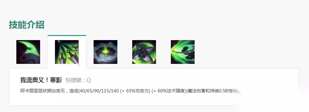 技能组合: W, R, Q, E, R, Q, Q, Q。 技能:第一个是 Q,第二个是 E,还有一个是 R。 阿卡丽在战斗中,首先要做的就是用 Q攻击对手,然后在对方的身上留下印记,等她的被动技能叠加到极致,再用 R攻击,造成额外的伤害。