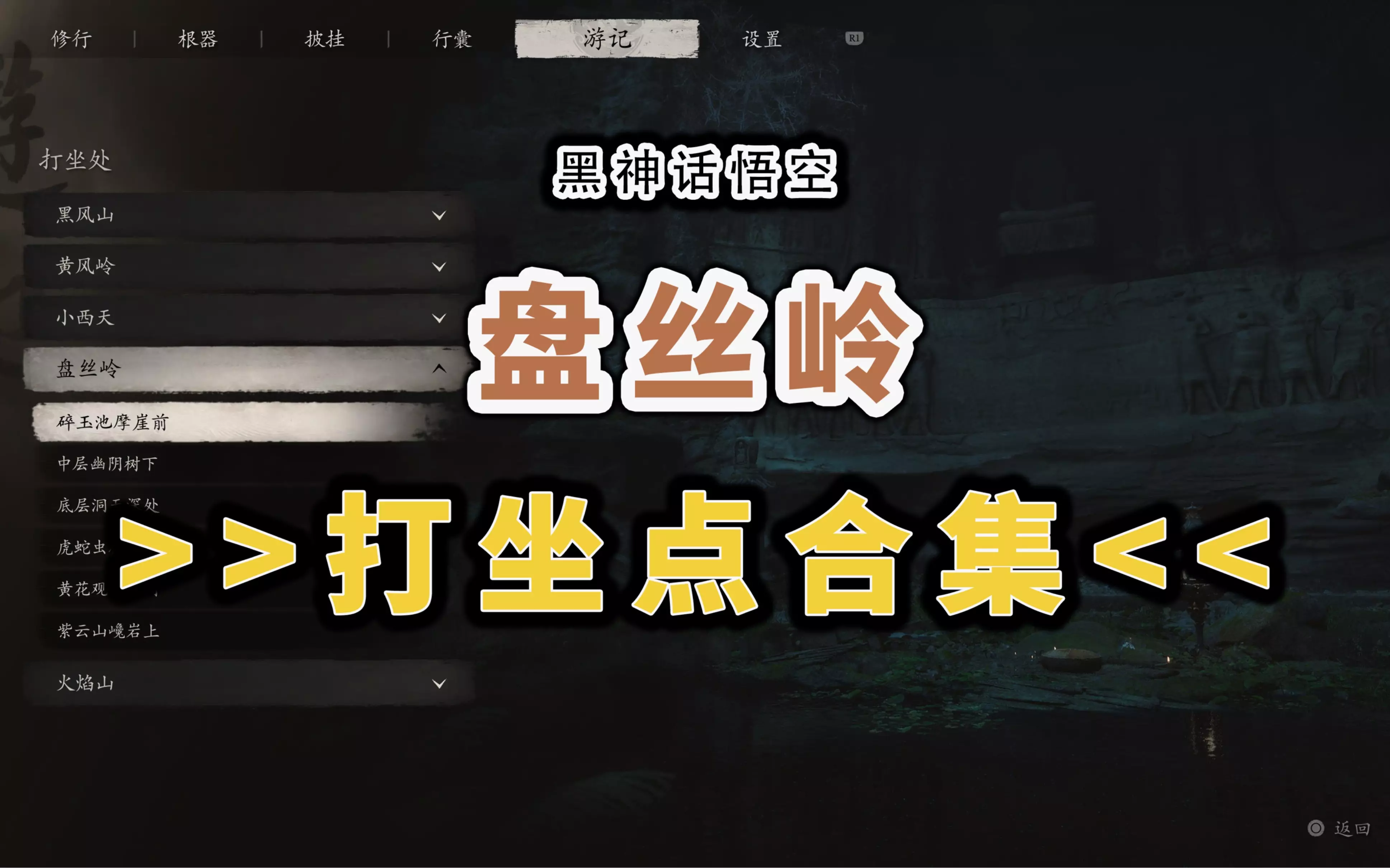 打坐点-盘丝岭 1 、碎玉池摩崖前 >>盘丝洞-碎玉池 2 、中层幽阴树下 >>盘丝洞-中层 3 、底层洞天深处 >>盘丝洞底层 4 、虎蛇虫林崖头 >>黄花观…