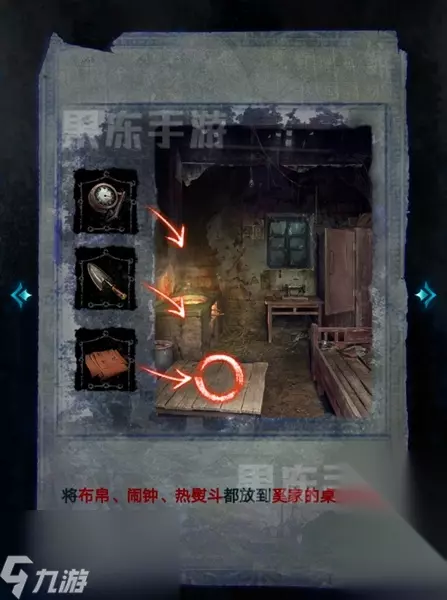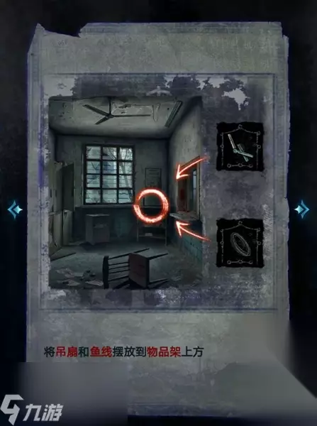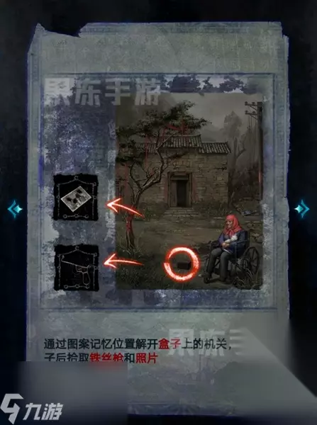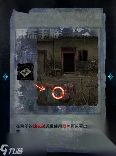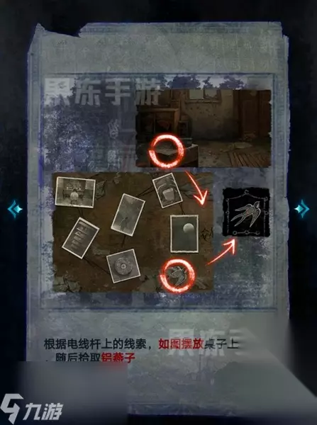 8、进入肖家后,点击桌子,随后根据电线杆的歌谣线索,将照片摆放成图中的样子,就可以拾取到铝燕子。