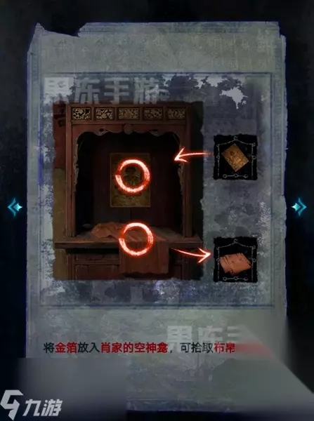 33、接着返回地面,将金箔放入肖家的神龛中,获取布帛。