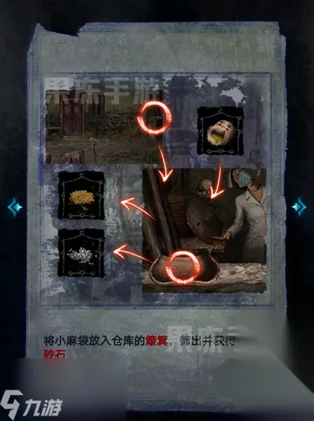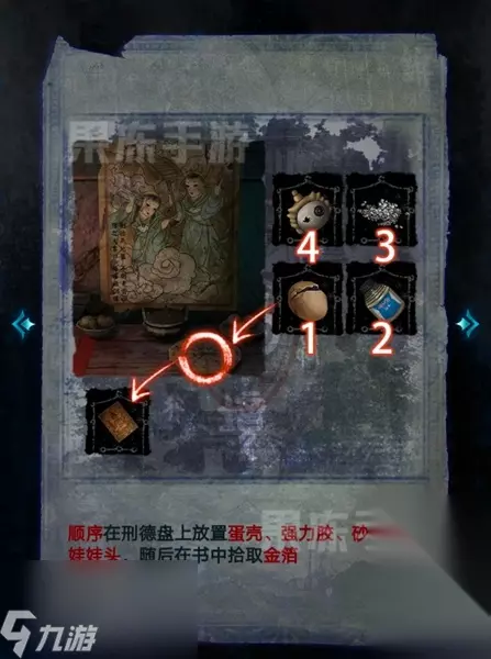 32、接着将蛋壳、强力胶、砂石、布娃娃头放到刑德盘上,在书中拾取金箔。