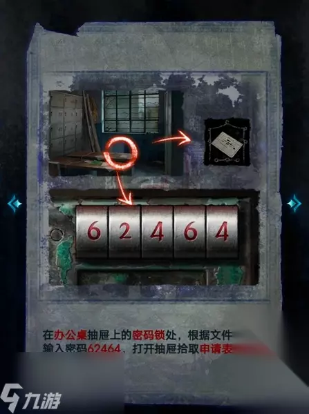 8、点击办公桌的抽屉,监视密码锁,输入文件柜的线索密码62464,就可以打开抽屉拾取申请表了。