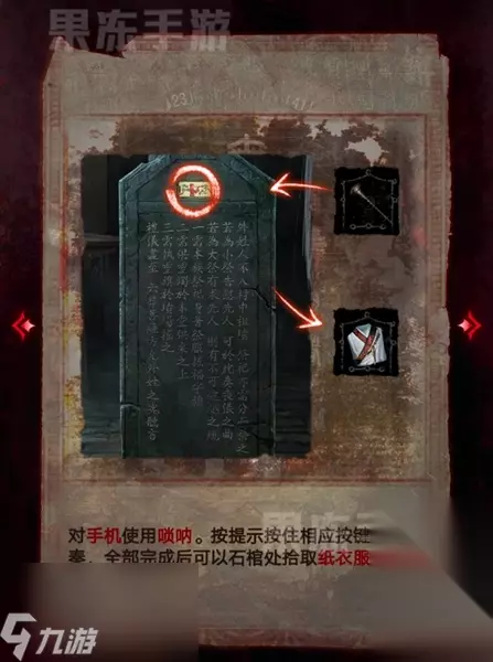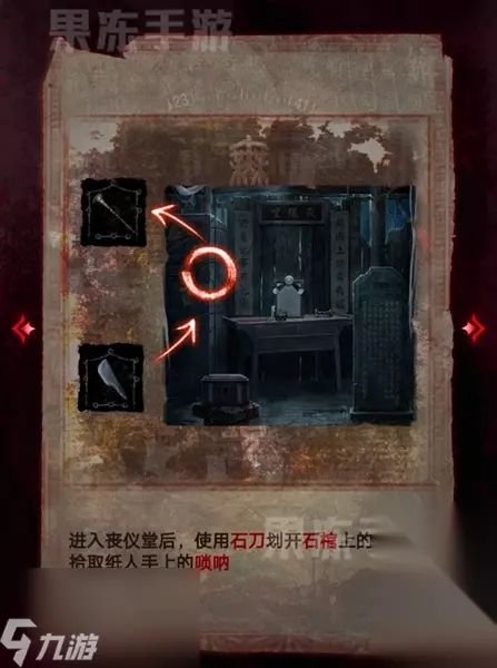 31、进入丧仪堂后,先用石刀划开石棺上的红绳,拾取纸人手中的唢呐。