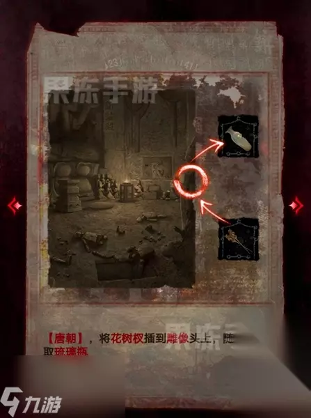 31、返回闻谕殿、切换为唐朝,将花树杈插到雕像偷师,拾取琉璃瓶。