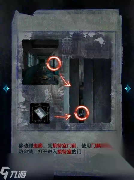 5、接着来到走廊,用门禁卡挑开接待室的防盗链,进入接待室中。