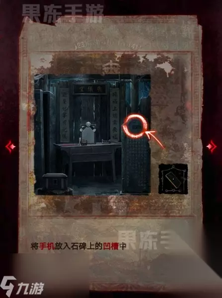 32、接着将手机放入右边石碑上的凹槽之中。