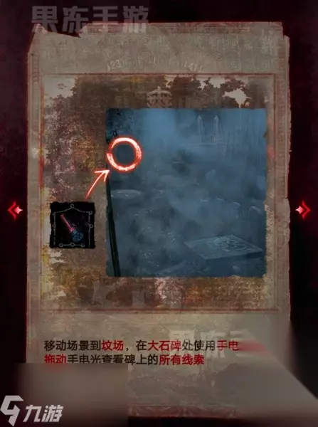 2、随后移动的分厂,在左侧大石碑处使用手电照明,拖动手电光来查看石碑上的线索。