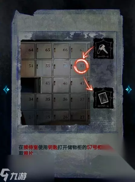 17、用钥匙打开接待室的57号储物柜,拾取其中的照片。