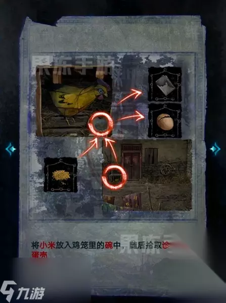 6、接着点击门旁的鸡窝,将小米放入鸡碗之中,就可以获得蛋壳和诊断书。