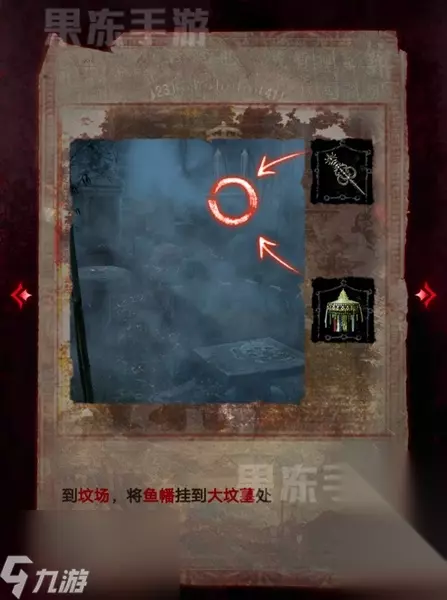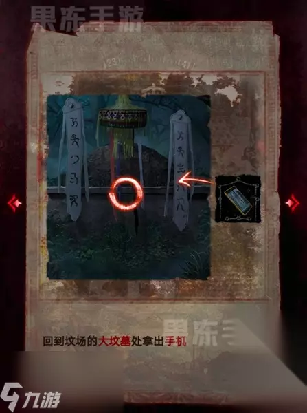 10、随后返回坟场,将鱼幡挂到大坟墓前,可以获得山洞石门的线索。