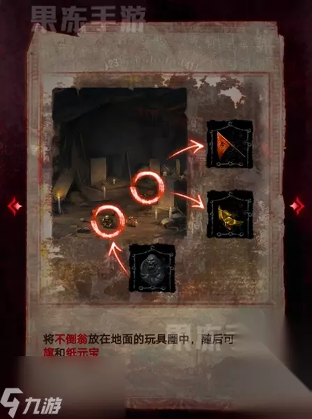 28、进入内部后,先将不倒翁放在地面的玩具圈中,随后拾取福字旗和纸元宝。