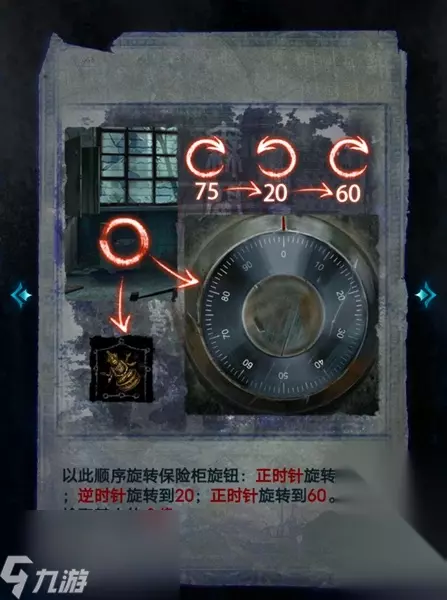 24、点击保险箱,先顺时针转到75°,接着逆时针转到20°,最后顺时针转到60°就可以打开保险箱获得金佛像。
