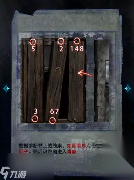7、随后点击窗户,根据诊断书上的线索,按顺序点击窗户上的钉子,随后就可以进入肖家。
