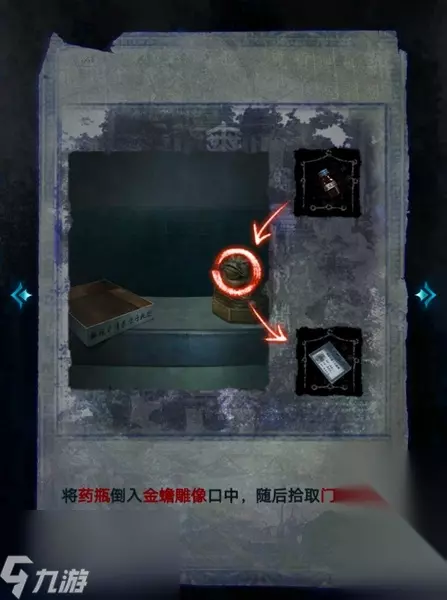4、将药瓶的药倒入前台金蝉雕像的口中,获取门禁卡。