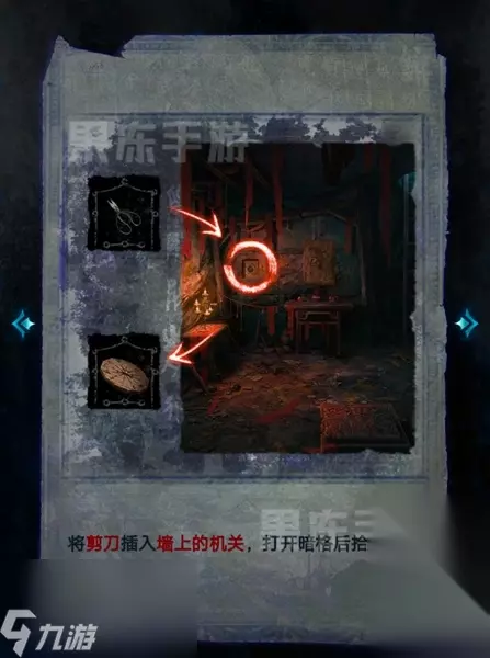 20、将剪刀插入墙壁上的机关,打开暗格后拾取其中的圆盘。