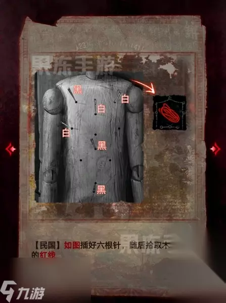 47,如图插好六根针,随后拾取木偶口中的红线。