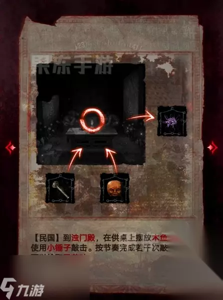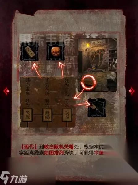 30、切换回现代,在歧白殿的机关箱处,根据木偶背上的线索排列滑块,获得木鱼、花树杈、字块。