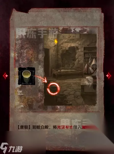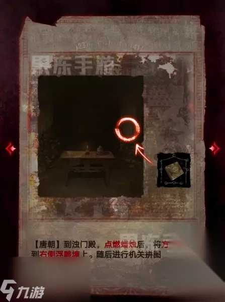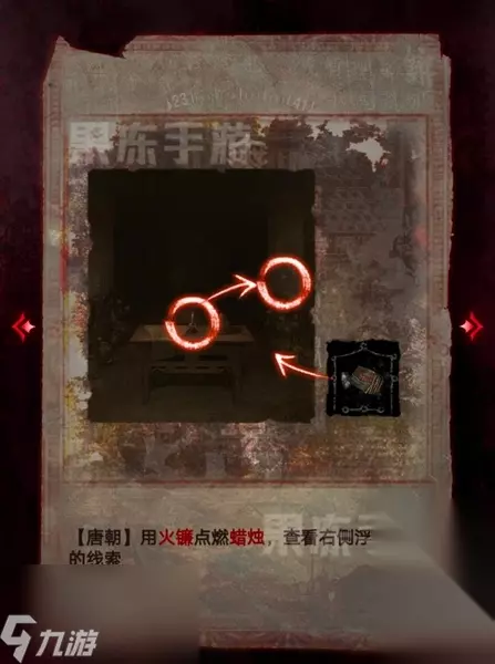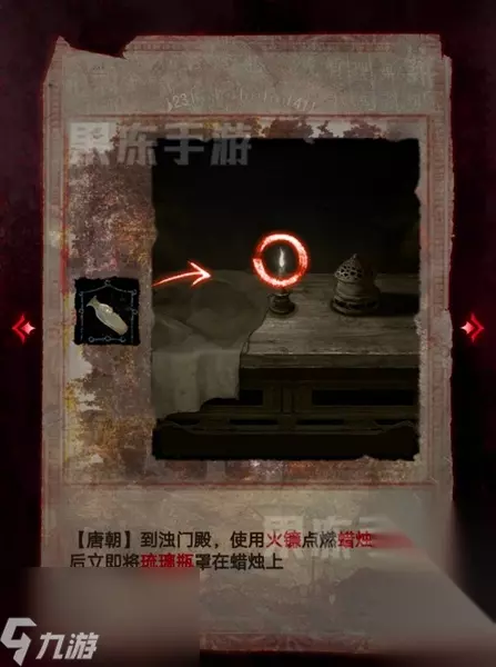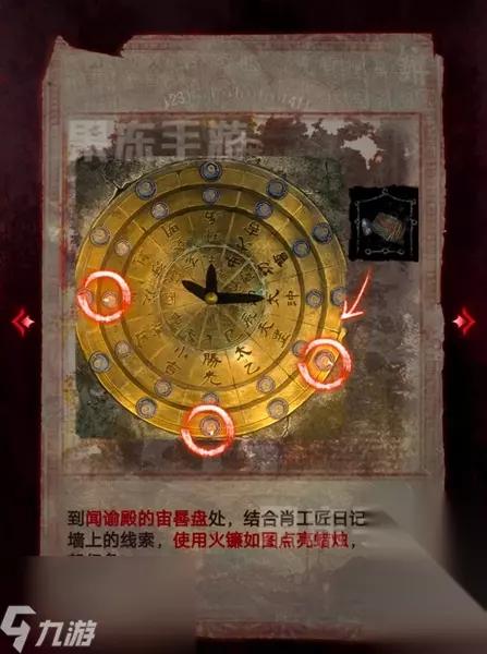 15、接着回到闻谕殿,在宙晷盘处,结合肖工匠的日记和浮雕墙上的线索,使用火镰如图点亮蜡烛,唤起唐朝幻象。