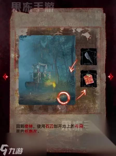 5、回到老人处,点击地上的布袋,用石刀割开,获取里面的纸寿衣。