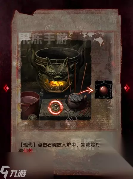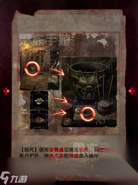 21、使用宙晷盘切换回现代,回到歧白殿的炼丹处,将赤爪实和神曲放入碗中。