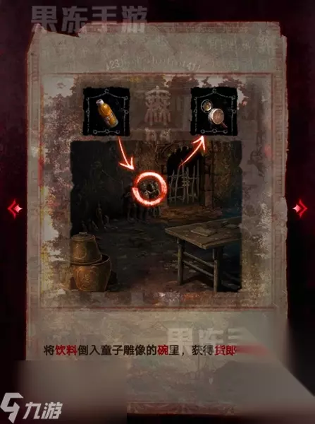 15、接着点击墙壁上的童子雕像,将饮料倒入碗中,就可以获得货郎鼓了。