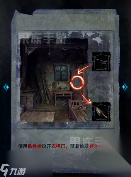 26、进入屋中后,用铁丝枪拉开衣柜门,拾取熨斗。