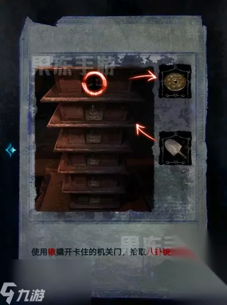 38、完成谜题后用铁锹撬开卡住的机关门,拾取其中的八卦镜,第三章剧情也就完成了。