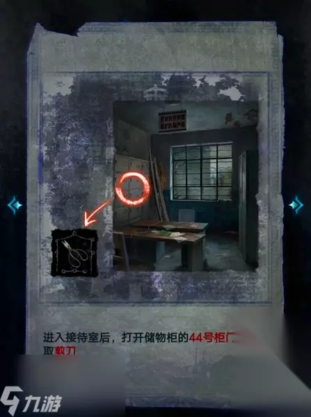 6、进入接待室后,打开44号储物柜,拾取其中的剪刀。