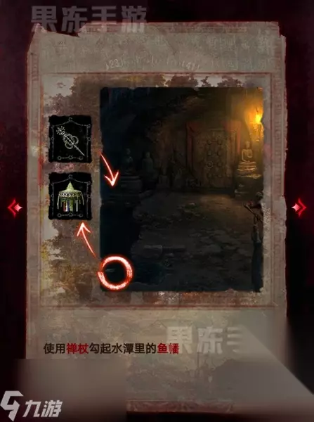 8、随后点击山洞左下的水潭,用禅杖勾起鱼幡。