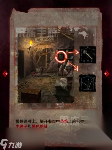 3、接着根据医书的线索,解开药箱的机关,获取小锤子和黑色的针。