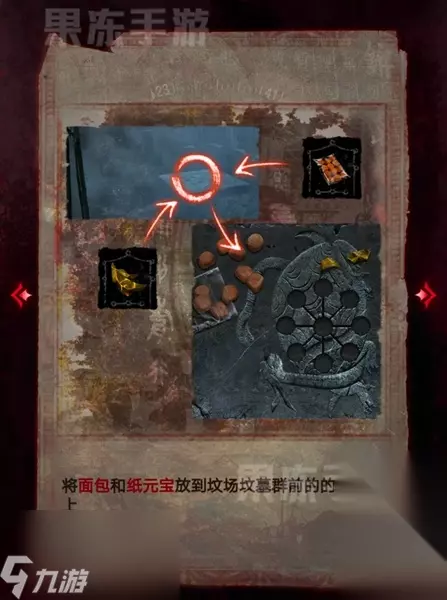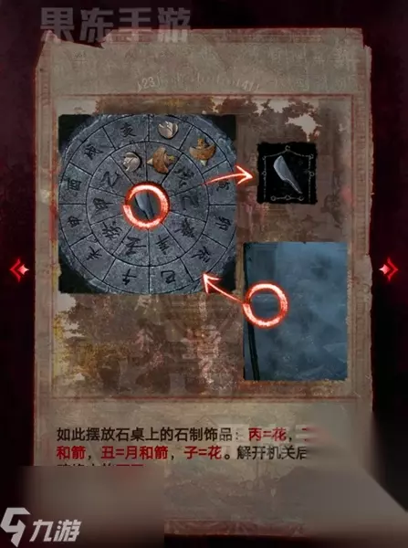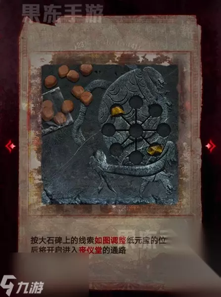 30、按照大石碑上的线索,将纸元宝调整成图中的样子,就可以开启进入丧仪堂的通路。