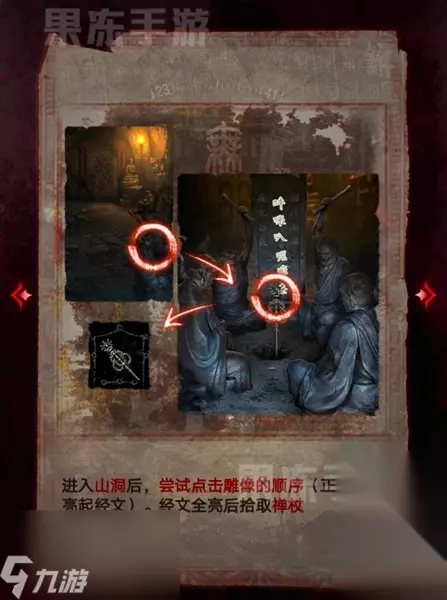 7、进入山洞后点击右下的雕像,解开谜题后可以获得禅杖。