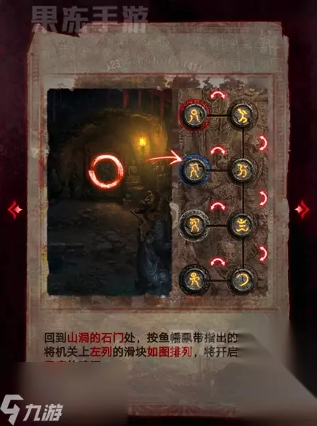 11、返回山洞的石门处,根据鱼幡飘带之处的线索,将石门上的滑块按照图中排列,就可以进入童子庙了。