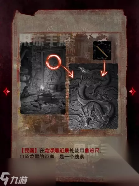 35、在浮雕处使用鲁班尺,测量龙口至龙尾的距离,获取线索。
