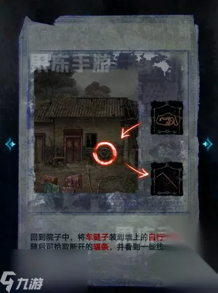 11、随后回到院子中,点击墙上的自行车,将车链子装上,获取断开的辐条和线索。