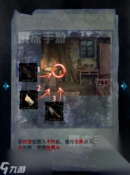 29、接着按照线索,将木材放入灶台,用蜡烛点火后加热熨斗,获取热熨斗。