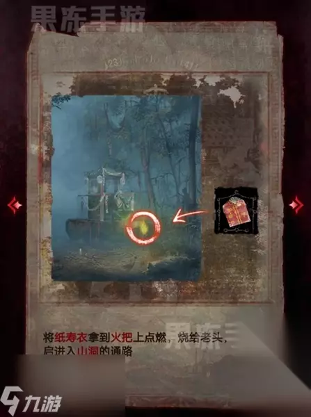 6、将纸寿衣移动到火把上点燃,就可以烧给老头,然后玩家就可以进入山洞之中。