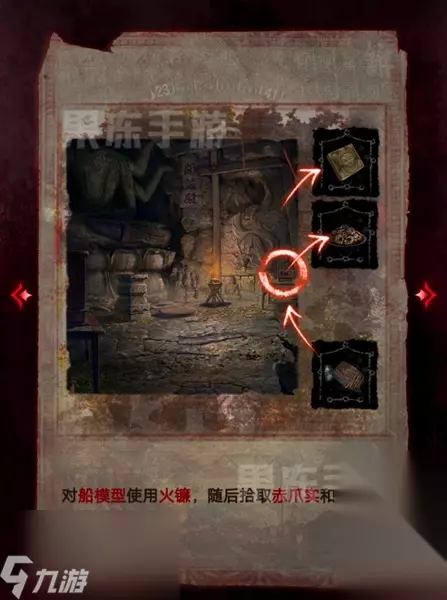 6、对右边桌子上的船模型使用火镰,随后拾取赤爪实和方砖。
